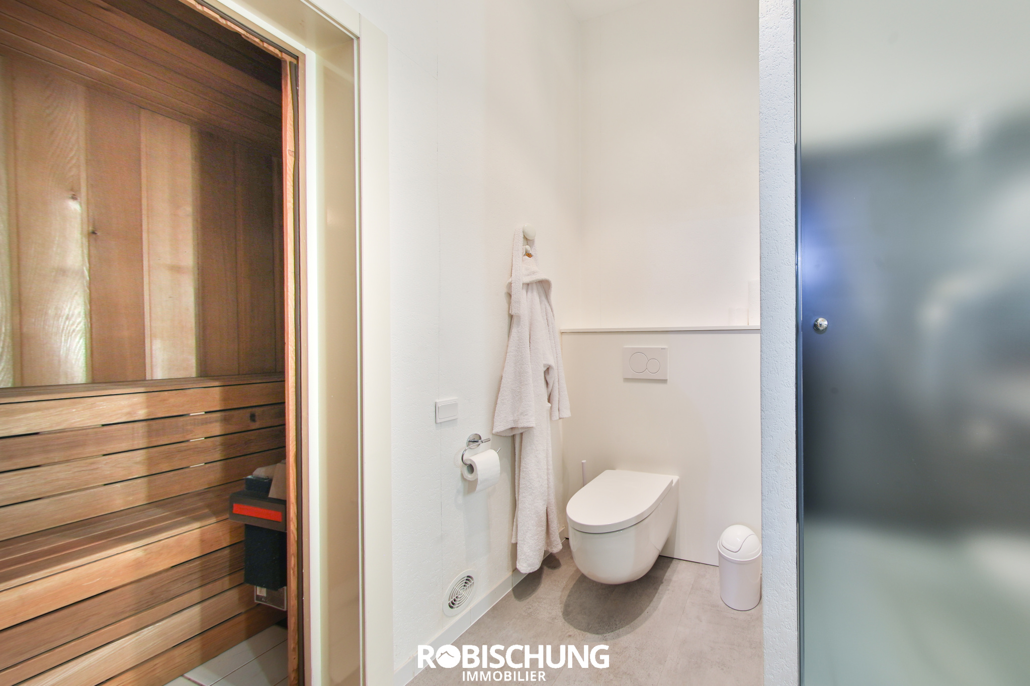 Au rez-de-chaussée, vous découvrirez un vaste hall d’accueil, un ascenseur, une salle de fitness avec salle d’eau, un espace sauna, une buanderie, une cave ainsi qu’un garage double.