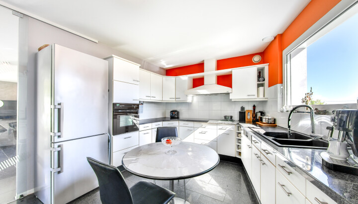À l’étage, un grand dégagement avec accès à l’ascenseur mène à un superbe salon-séjour lumineux (chauffage au sol et sols en marbre) avec vue sur le jardin et la piscine. Vous profiterez de la chaleur d’une cheminée centrale, d’une cuisine entièrement équipée avec accès direct à une terrasse couverte. Ce niveau comprend également deux chambres, une salle d’eau et des toilettes séparées.